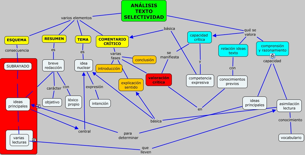 Este Cmap, tiene información relacionada con: Análisis_texto, ESQUEMA consecuencia SUBRAYADO, COMENTARIO CRÍTICO varias fases valoración crítica, SUBRAYADO técnica ideas principales, RESUMEN es breve redacción, ideas principales para determinar ideas principales, ANÁLISIS TEXTO SELECTIVIDAD varios elementos COMENTARIO CRÍTICO, ANÁLISIS TEXTO SELECTIVIDAD qué se valora comprensión y razonamiento, idea nuclear expresión intención, comprensión y razonamiento capacidad ideas principales, capacidad crítica se manifiesta valoración crítica, ANÁLISIS TEXTO SELECTIVIDAD qué se valora relación ideas texto, ANÁLISIS TEXTO SELECTIVIDAD qué se valora capacidad crítica, asimilación lectura conocimiento vocabulario, COMENTARIO CRÍTICO varias fases explicación sentido, ANÁLISIS TEXTO SELECTIVIDAD varios elementos ESQUEMA, ideas principales central idea nuclear, TEMA es idea nuclear, competencia expresiva básica COMENTARIO CRÍTICO, ANÁLISIS TEXTO SELECTIVIDAD varios elementos RESUMEN, ideas principales tras varias lecturas