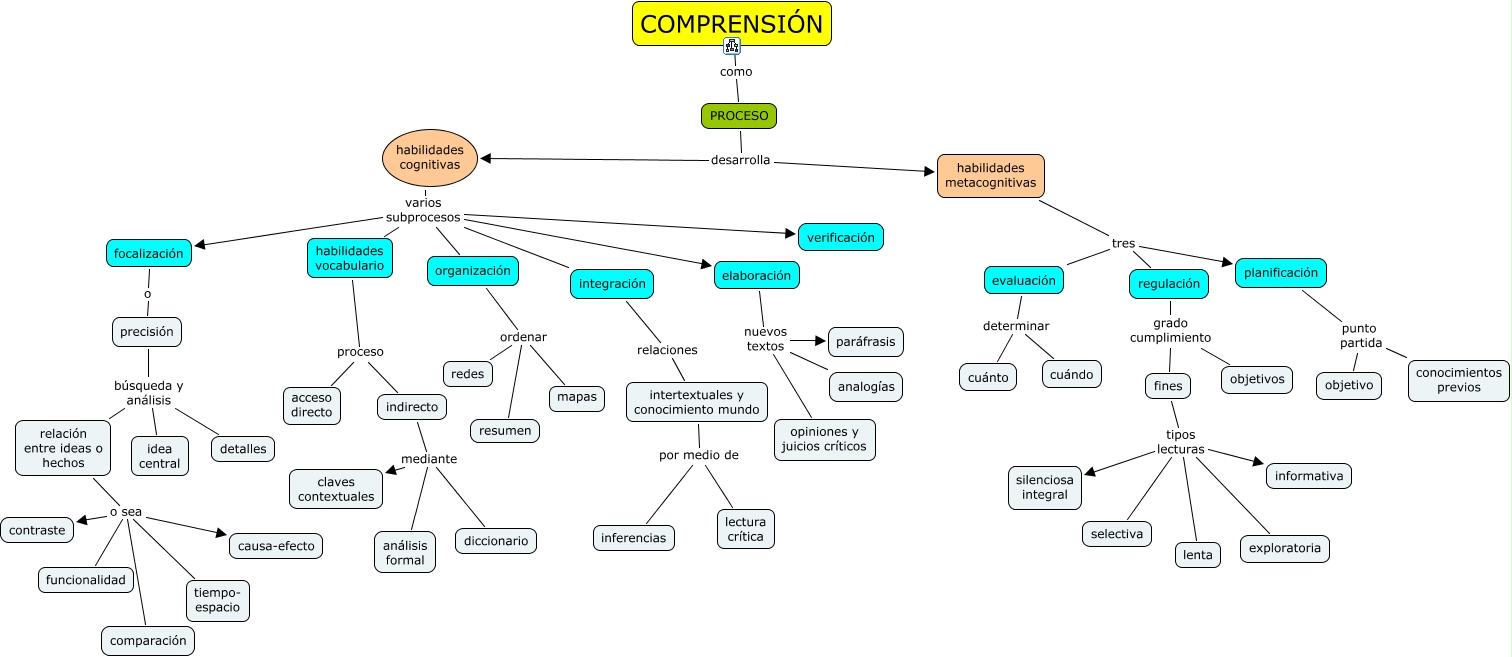 Este Cmap, tiene información relacionada con: Comprensión-cognitiva, intertextuales y conocimiento mundo por medio de inferencias, habilidades vocabulario proceso indirecto, fines tipos lecturas informativa, PROCESO desarrolla habilidades cognitivas, precisión búsqueda y análisis relación entre ideas o hechos, elaboración nuevos textos opiniones y juicios críticos, habilidades cognitivas varios subprocesos elaboración, indirecto mediante diccionario, indirecto mediante claves contextuales, relación entre ideas o hechos o sea comparación, habilidades metacognitivas tres evaluación, elaboración nuevos textos analogías, COMPRENSIÓN como PROCESO, habilidades metacognitivas tres planificación, fines tipos lecturas selectiva, habilidades vocabulario proceso acceso directo, elaboración nuevos textos paráfrasis, relación entre ideas o hechos o sea tiempo- espacio, organización ordenar redes, fines tipos lecturas exploratoria