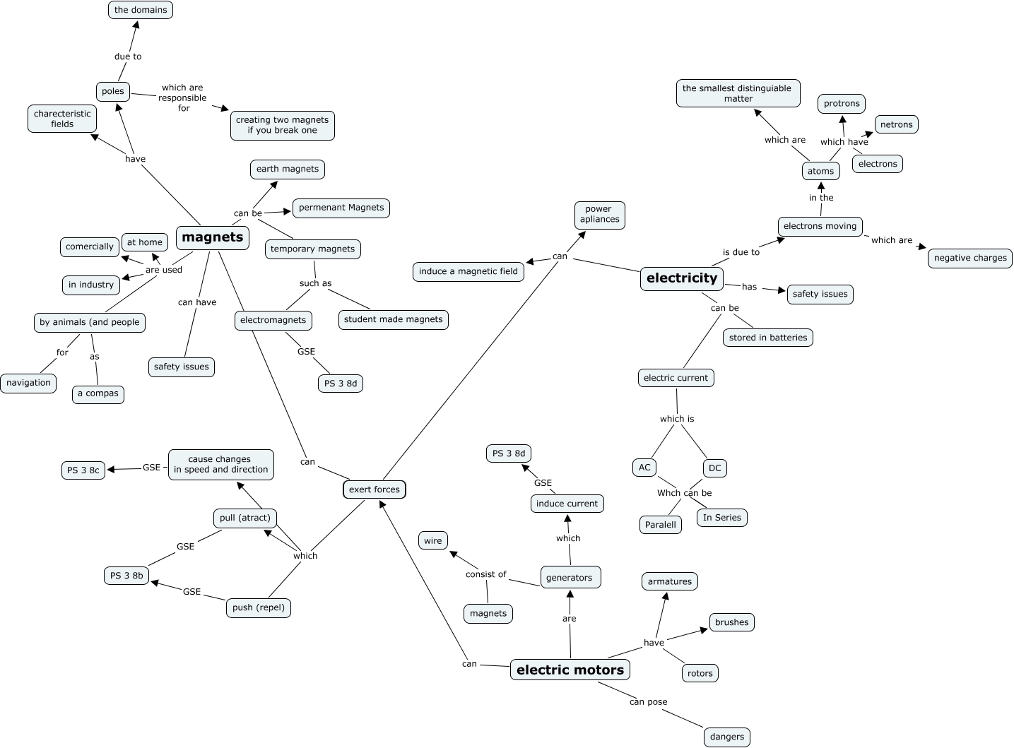 This Concept Map, created with IHMC CmapTools, has information related to: magnets, motors and electricity, DC In Series, AC Whch can be Paralell, AC Whch can be In Series, magnets have poles, atoms which have electrons, electric motors are generators, by animals (and people for navigation, push (repel) GSE PS 3 8b, magnets have charecteristic fields, cause changes in speed and direction GSE PS 3 8c, magnets are used at home, electric motors have brushes, magnets are used comercially, induce current GSE PS 3 8d, generators which induce current, electric current which is AC, generators consist of wire, poles due to the domains, magnets can be earth magnets, poles which are responsible for creating two magnets if you break one
