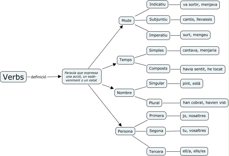 Aquest mapa conceptual conté informació relacionada amb: Verbs, Mode Imperatiu, Subjuntiu cantis, llevassis, Segona tu, vosaltres, Singular pint, està, Composts havia sentit, he tocat, Temps Composts, Mode Subjuntiu, Paraula que expressa una acció, un esde- veniment o un estat Nombre, Mode Indicatiu, Simples cantava, menjaria, Imperatiu surt, mengeu, Paraula que expressa una acció, un esde- veniment o un estat Persona, Persona Segona, Paraula que expressa una acció, un esde- veniment o un estat Temps, Indicatiu va sortir, menjava, Tercera ell/a, ells/es, Primera jo, nosaltres, Persona Primera, Persona Tercera, Nombre Singular