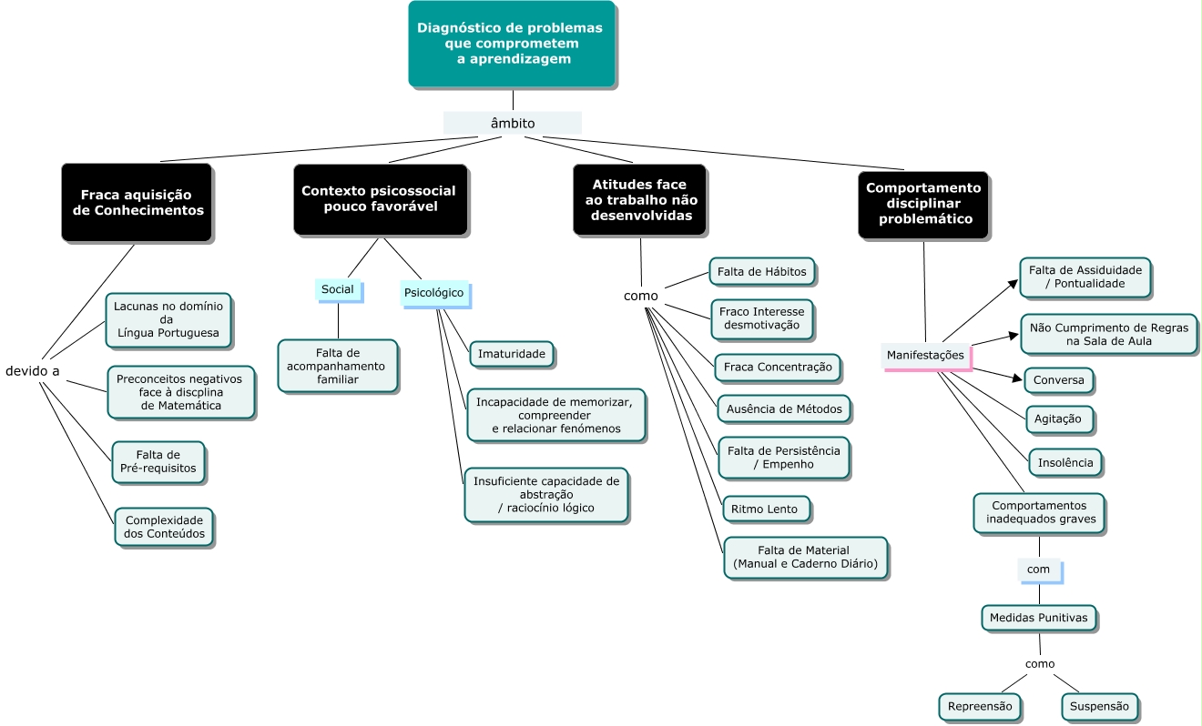 Esse mapa conceitual, produzido no IHMC CmapTools, tem a informação relacionada a: 3º Ciclo - Actas - Justificação dos Níveis Inferiores a 3 - 20082009_2, Comportamento disciplinar problemático Manifestações Insolência, Atitudes face ao trabalho não desenvolvidas como Falta de Persistência / Empenho, Contexto psicossocial pouco favorável Psicológico Incapacidade de memorizar, compreender e relacionar fenómenos, Contexto psicossocial pouco favorável Psicológico Insuficiente capacidade de abstração / raciocínio lógico, Atitudes face ao trabalho não desenvolvidas como Fraco Interesse desmotivação, Comportamento disciplinar problemático Manifestações Comportamentos inadequados graves, Diagnóstico de problemas que comprometem a aprendizagem âmbito Fraca aquisição de Conhecimentos, Atitudes face ao trabalho não desenvolvidas como Fraca Concentração, Diagnóstico de problemas que comprometem a aprendizagem âmbito Contexto psicossocial pouco favorável, Atitudes face ao trabalho não desenvolvidas como Ritmo Lento, Atitudes face ao trabalho não desenvolvidas como Falta de Hábitos, Fraca aquisição de Conhecimentos devido a Lacunas no domínio da Língua Portuguesa, Comportamento disciplinar problemático Manifestações Conversa, Comportamento disciplinar problemático Manifestações Não Cumprimento de Regras na Sala de Aula, Fraca aquisição de Conhecimentos devido a Complexidade dos Conteúdos, Comportamentos inadequados graves com Medidas Punitivas, Contexto psicossocial pouco favorável Psicológico Imaturidade, Fraca aquisição de Conhecimentos devido a Falta de Pré-requisitos, Medidas Punitivas como Suspensão, Atitudes face ao trabalho não desenvolvidas como Falta de Material (Manual e Caderno Diário)