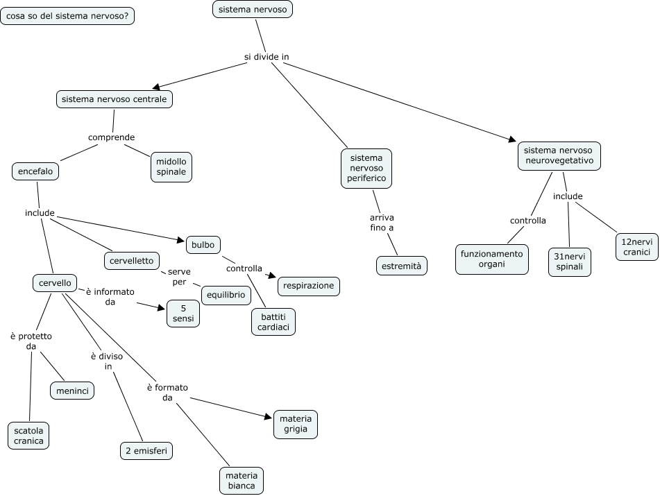 Questa Cmap, creata con IHMC CmapTools, contiene informazioni relative a: map conc sistema nervoso Lorenzo, sistema nervoso neurovegetativo include 31nervi spinali, encefalo include bulbo, sistema nervoso neurovegetativo include 12nervi cranici, encefalo include cervello, cervelletto serve per equilibrio, sistema nervoso neurovegetativo controlla funzionamento organi, bulbo controlla battiti cardiaci, cervello è protetto da scatola cranica, cervello è diviso in 2 emisferi, cervello è informato da 5 sensi, bulbo controlla respirazione, sistema nervoso centrale comprende midollo spinale, cervello è formato da materia grigia, sistema nervoso centrale comprende encefalo, sistema nervoso si divide in sistema nervoso periferico, sistema nervoso si divide in sistema nervoso neurovegetativo, cervello è protetto da meninci, encefalo include cervelletto, sistema nervoso periferico arriva fino a estremità, cervello è formato da materia bianca