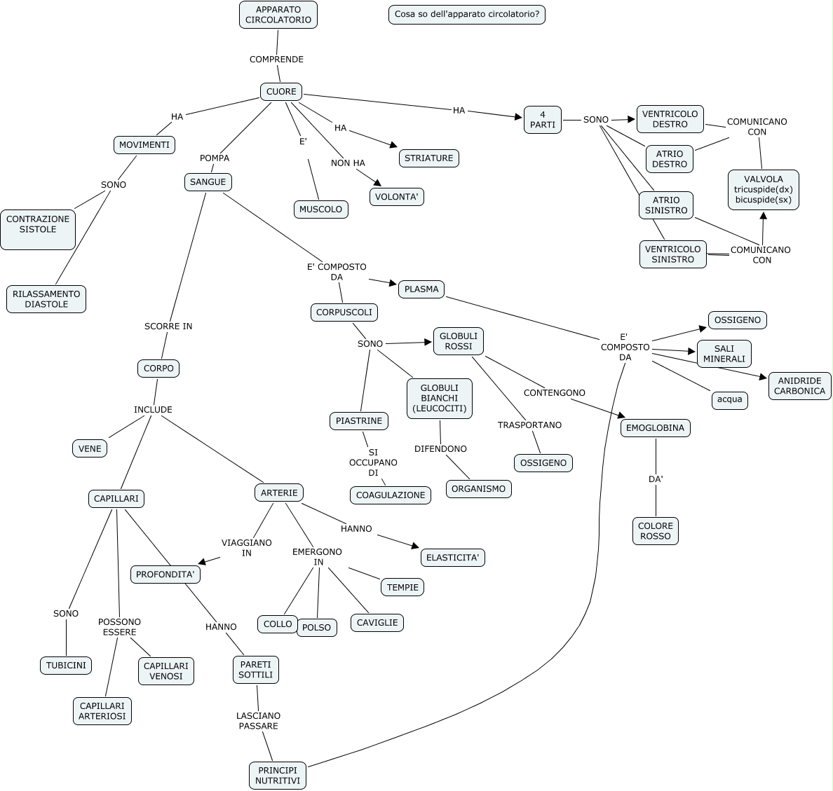 Questa Cmap, creata con IHMC CmapTools, contiene informazioni relative a: MAPPA CONCETTUALE SISTEMA CIRCOLATORIO PAOLA, PRINCIPI NUTRITIVI E' COMPOSTO DA acqua, 4 PARTI SONO VENTRICOLO SINISTRO, CAPILLARI HANNO PARETI SOTTILI, CAPILLARI POSSONO ESSERE CAPILLARI ARTERIOSI, MOVIMENTI SONO RILASSAMENTO DIASTOLE, PARETI SOTTILI LASCIANO PASSARE PRINCIPI NUTRITIVI, VENTRICOLO SINISTRO COMUNICANO CON ????, PIASTRINE SI OCCUPANO DI COAGULAZIONE, VENTRICOLO DESTRO COMUNICANO CON VALVOLA tricuspide(dx) bicuspide(sx), CORPUSCOLI SONO GLOBULI ROSSI, CAPILLARI POSSONO ESSERE CAPILLARI VENOSI, CORPUSCOLI SONO GLOBULI BIANCHI (LEUCOCITI), MOVIMENTI SONO CONTRAZIONE SISTOLE, CORPO INCLUDE VENE, ARTERIE EMERGONO IN TEMPIE, GLOBULI ROSSI CONTENGONO EMOGLOBINA, VENTRICOLO SINISTRO COMUNICANO CON VALVOLA tricuspide(dx) bicuspide(sx), ATRIO SINISTRO COMUNICANO CON VALVOLA tricuspide(dx) bicuspide(sx), CUORE HA 4 PARTI, CORPO INCLUDE ARTERIE