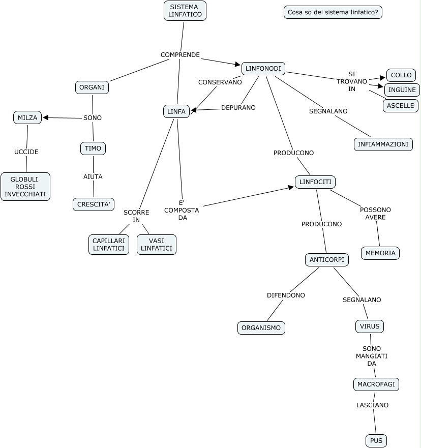 Questa Cmap, creata con IHMC CmapTools, contiene informazioni relative a: MAPPA CONCETTUALE SISTEMA LINFATICO PAOLA, ORGANI SONO MILZA, MILZA UCCIDE GLOBULI ROSSI INVECCHIATI, LINFONODI SI TROVANO IN ASCELLE, LINFONODI DEPURANO LINFA, SISTEMA LINFATICO COMPRENDE LINFONODI, LINFONODI SI TROVANO IN COLLO, LINFA SCORRE IN CAPILLARI LINFATICI, ORGANI SONO TIMO, LINFOCITI PRODUCONO ANTICORPI, LINFONODI PRODUCONO LINFOCITI, VIRUS SONO MANGIATI DA MACROFAGI, LINFOCITI POSSONO AVERE MEMORIA, ANTICORPI SEGNALANO VIRUS, LINFA E' COMPOSTA DA LINFOCITI, MACROFAGI LASCIANO PUS, TIMO AIUTA CRESCITA', LINFONODI SI TROVANO IN INGUINE, LINFONODI SEGNALANO INFIAMMAZIONI, SISTEMA LINFATICO COMPRENDE LINFA, ANTICORPI DIFENDONO ORGANISMO
