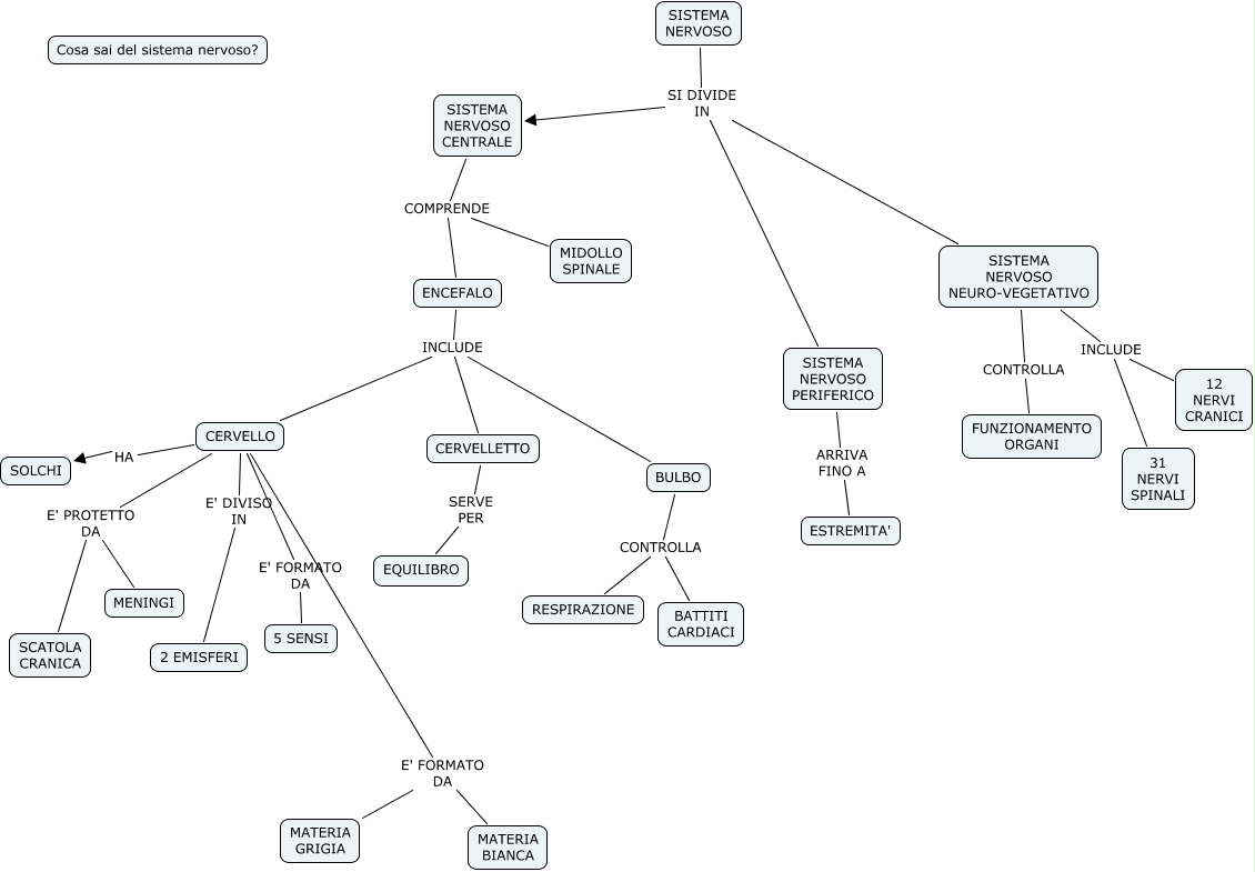 Questa Cmap, creata con IHMC CmapTools, contiene informazioni relative a: MAPPA MENTALE SISTEMA NERVOSO PAOLA, SISTEMA NERVOSO SI DIVIDE IN SISTEMA NERVOSO NEURO-VEGETATIVO, CERVELLO E' PROTETTO DA SCATOLA CRANICA, CERVELLETTO SERVE PER EQUILIBRO, ENCEFALO INCLUDE BULBO, SISTEMA NERVOSO PERIFERICO ARRIVA FINO A ESTREMITA', ENCEFALO INCLUDE CERVELLO, SISTEMA NERVOSO SI DIVIDE IN SISTEMA NERVOSO CENTRALE, BULBO CONTROLLA RESPIRAZIONE, CERVELLO E' FORMATO DA MATERIA BIANCA, SISTEMA NERVOSO CENTRALE COMPRENDE ENCEFALO, CERVELLO E' FORMATO DA MATERIA GRIGIA, CERVELLO E' PROTETTO DA MENINGI, SISTEMA NERVOSO NEURO-VEGETATIVO INCLUDE 12 NERVI CRANICI, CERVELLO E' FORMATO DA 5 SENSI, SISTEMA NERVOSO NEURO-VEGETATIVO CONTROLLA FUNZIONAMENTO ORGANI, CERVELLO E' DIVISO IN 2 EMISFERI, CERVELLO HA SOLCHI, BULBO CONTROLLA BATTITI CARDIACI, SISTEMA NERVOSO SI DIVIDE IN SISTEMA NERVOSO PERIFERICO, SISTEMA NERVOSO NEURO-VEGETATIVO INCLUDE 31 NERVI SPINALI
