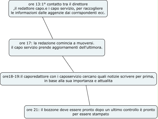 quotidiano schema luca m, ore18-19:il caporedattore con i caposervizio cercano quali notizie scrivere per prima, in base alla sua importanza e attualita ???? ore 21: il bozzone deve essere pronto dopo un ultimo controllo è pronto per essere stampato, ore 13:1° contatto tra il direttore ,il redattore capo.e i capo servizio, per raccogliere le informazioni dalle aggenzie dai corrispondenti ecc. ???? ore 17: la redazione comincia a muoversi. il capo servizio prende aggiornamenti dell'ultimora., ore 17: la redazione comincia a muoversi. il capo servizio prende aggiornamenti dell'ultimora. ???? ore18-19:il caporedattore con i caposervizio cercano quali notizie scrivere per prima, in base alla sua importanza e attualita