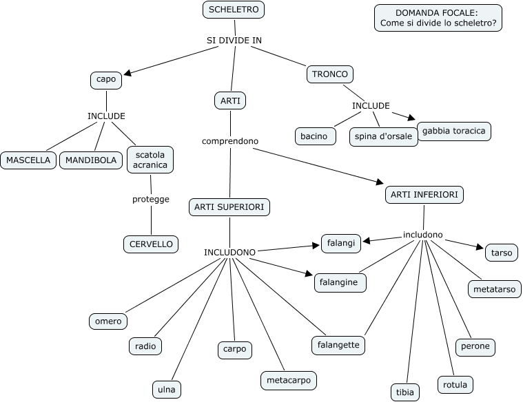 mappa concettualescheletro 1 elena, ARTI SUPERIORI INCLUDONO ulna, ARTI SUPERIORI INCLUDONO falangette, TRONCO INCLUDE bacino, ARTI SUPERIORI INCLUDONO omero, ARTI INFERIORI includono falangi, ARTI SUPERIORI INCLUDONO carpo, ARTI INFERIORI includono perone, ARTI INFERIORI includono rotula, ARTI comprendono ARTI INFERIORI, scatola acranica protegge CERVELLO