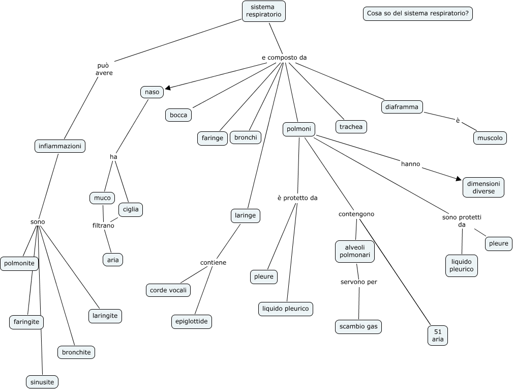 Questa Cmap, creata con IHMC CmapTools, contiene informazioni relative a: sistema respiratorio mappa concettuale ivan, sistema respiratorio e composto da bocca, sistema respiratorio e composto da diaframma, muco filtrano aria, ciglia filtrano aria, naso ha ciglia, sistema respiratorio e composto da bronchi, sistema respiratorio e composto da laringe, diaframma è muscolo, polmoni sono protetti da liquido pleurico, naso ha muco, polmoni è protetto da liquido pleurico, alveoli polmonari servono per scambio gas, sistema respiratorio e composto da naso, polmoni hanno dimensioni diverse, infiammazioni sono laringite, infiammazioni sono bronchite, sistema respiratorio e composto da faringe, sistema respiratorio e composto da trachea, laringe contiene epiglottide, infiammazioni sono sinusite