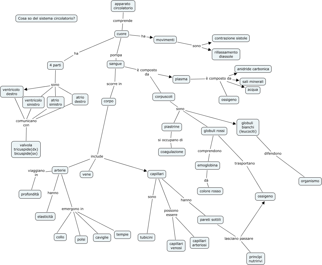 Questa Cmap, creata con IHMC CmapTools, contiene informazioni relative a: apparato circolato mappa concettuale, cuore pompa sangue, corpo include vene, plasma è composto da sali minerali, arterie hanno elasticità, plasma è composto da anidride carbonica, arterie emergono in polsi, atrio sinistro comunicano con valvola tricuspide(dx) bicuspide(sx), 4 parti sono atrio sinistro, corpuscoli sono globuli rossi, corpuscoli sono globuli bianchi (leucociti), arterie emergono in caviglie, atrio destro comunicano con valvola tricuspide(dx) bicuspide(sx), pareti sottili lasciano passare princìpi nutririvi, cuore ha movimenti, corpo include capillari, arterie viaggiano in profondità, movimenti sono rillassamento diassole, sangue scorre in corpo, capillari possono essere capillari arteriosi, 4 parti sono atrio destro