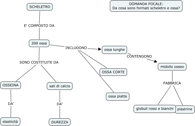 SCHELETRO2 mapppa concettuale giacomoc, sali di calcio DA' DUREZZA, 200 ossa INCLUDONO OSSA CORTE, SCHELETRO E' COMPOSTO DA 200 ossa, OSSEINA DA' elasticità, midollo osseo FABBRICA globuli rossi e bianchi, ossa lunghe CONTENGONO midollo osseo, 200 ossa SONO COSTITUITE DA sali di calcio, 200 ossa INCLUDONO ossa piatte, 200 ossa INCLUDONO ossa lunghe, midollo osseo FABBRICA piastrine