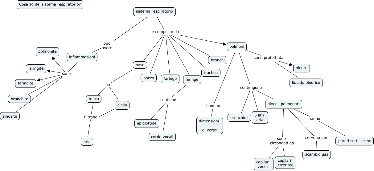 Questa Cmap, creata con IHMC CmapTools, contiene informazioni relative a: sistema respiratorio mappa concettuale giacomo c, infiammazioni sono faringite, polmoni sono protetti da liquido pleurico, infiammazioni sono laringite, sistema respiratorio e composto da faringe, naso ha ciglia, laringe contiene epiglottide, infiammazioni sono bronchite, sistema respiratorio e composto da bronchi, infiammazioni sono sinusite, infiammazioni sono polmonite, sistema respiratorio può avere infiammazioni, polmoni contengono alveoli polmonari, sistema respiratorio e composto da laringe, naso ha muco, polmoni contengono 5 litri aria, sistema respiratorio e composto da naso, polmoni contengono bronchioli, muco filtrano aria, laringe contiene corde vocali, alveoli polmonari sono circondati da capilari venosi