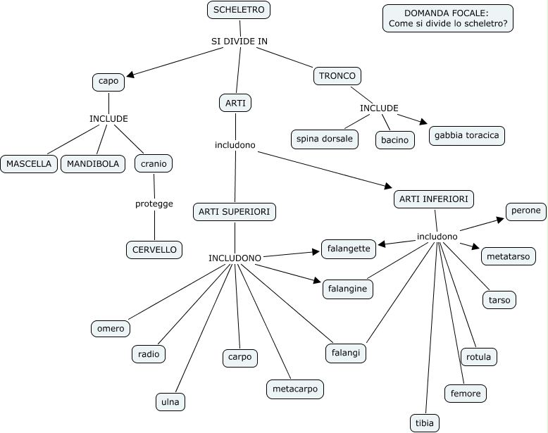 scheletro1mappa concettuale giacomo c, ARTI SUPERIORI INCLUDONO falangi, ARTI SUPERIORI INCLUDONO ulna, TRONCO INCLUDE spina dorsale, ARTI INFERIORI includono perone, ARTI SUPERIORI INCLUDONO carpo, ARTI INFERIORI includono falangette, ARTI SUPERIORI INCLUDONO omero, ARTI INFERIORI includono femore, ARTI INFERIORI includono rotula, ARTI includono ARTI INFERIORI