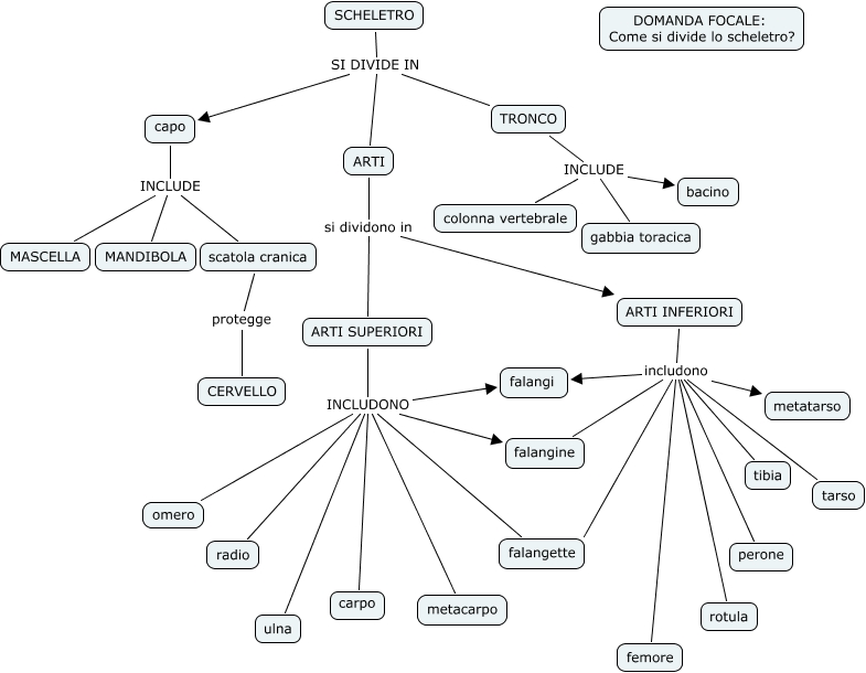 map conc scheletro1 giacomo b, ARTI SUPERIORI INCLUDONO falangette, ARTI SUPERIORI INCLUDONO ulna, TRONCO INCLUDE bacino, ARTI SUPERIORI INCLUDONO carpo, TRONCO INCLUDE colonna vertebrale, ARTI INFERIORI includono falangi, ARTI SUPERIORI INCLUDONO omero, ARTI INFERIORI includono rotula, ARTI INFERIORI includono perone, ARTI si dividono in ARTI INFERIORI