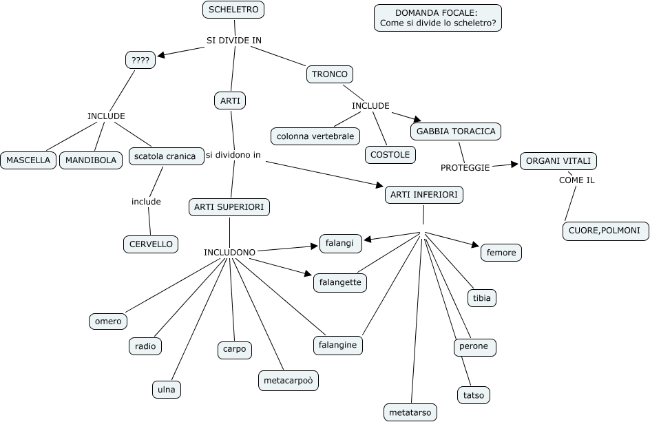 map con scheletro1Greta, ARTI INFERIORI falangine, SCHELETRO SI DIVIDE IN TRONCO, ARTI INFERIORI tibia, GABBIA TORACICA PROTEGGIE ORGANI VITALI, SCHELETRO SI DIVIDE IN ????, ARTI SUPERIORI INCLUDONO carpo, ARTI SUPERIORI INCLUDONO ulna, ARTI SUPERIORI INCLUDONO falangi, TRONCO INCLUDE COSTOLE, ORGANI VITALI COME IL CUORE,POLMONI