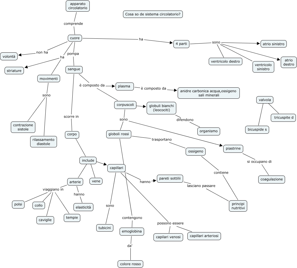Questa Cmap, creata con IHMC CmapTools, contiene informazioni relative a: map con apparato circolatorio Greta, arterie viaggiano in polsi, piastrine si occupano di coagulazione, 4 parti sono ventricolo sinistro, cuore pompa sangue, corpuscoli ???? globuli bianchi (leocociti), valvola ???? tricuspite d, 4 parti sono atrio sinistro, emoglobina da' colore rosso, sangue è composto da plasma, cuore ha 4 parti, 4 parti sono ventricolo destro, arterie viaggiano in tempie, corpuscoli sono piastrine, globoli rossi trasportano ossigeno, movimenti sono rilassamento diastole, globuli bianchi (leocociti) difendono organismo, globoli rossi contengono emoglobina, arterie viaggiano in collo, include ???? capillari, cuore ha striature
