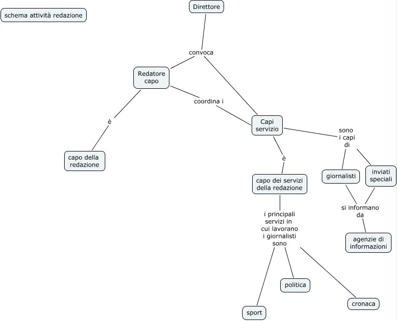 Questa Cmap, creata con IHMC CmapTools, contiene informazioni relative a: organigramma Desiree schema, capo dei servizi della redazione i principali servizi in cui lavorano i giornalisti sono politica, Capi servizio sono i capi di inviati speciali, giornalisti si informano da agenzie di informazioni, Redatore capo è capo della redazione, inviati speciali si informano da agenzie di informazioni, Redatore capo coordina i Capi servizio, Capi servizio è capo dei servizi della redazione, Direttore convoca Capi servizio, capo dei servizi della redazione i principali servizi in cui lavorano i giornalisti sono cronaca, capo dei servizi della redazione i principali servizi in cui lavorano i giornalisti sono sport, Direttore convoca Redatore capo, Capi servizio sono i capi di giornalisti