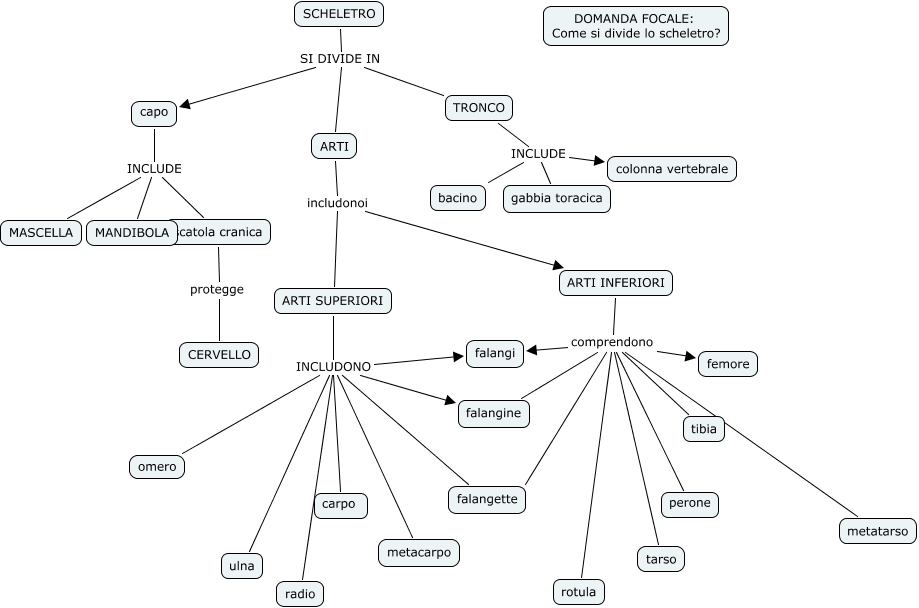 scheletro1mappa concettuale Desiree, ARTI SUPERIORI INCLUDONO falangette, ARTI SUPERIORI INCLUDONO ulna, TRONCO INCLUDE bacino, ARTI INFERIORI comprendono rotula, ARTI SUPERIORI INCLUDONO carpo, ARTI INFERIORI comprendono falangi, ARTI SUPERIORI INCLUDONO omero, ARTI INFERIORI comprendono tarso, ARTI INFERIORI comprendono perone, ARTI includonoi ARTI INFERIORI