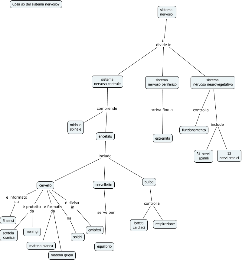 Questa Cmap, creata con IHMC CmapTools, contiene informazioni relative a: Sistema nervoso mappa concettuale Desiree, cervello ha solchi, sistema nervoso si divide in sistema nervoso centrale, sistema nervoso neurovegetativo include 12 nervi cranici, bulbo controlla respirazione, encefalo include cervello, cervello è formato da materia grigia, sistema nervoso neurovegetativo controlla funzionamento, sistema nervoso centrale comprende encefalo, cervello è informato da 5 sensi, bulbo controlla battiti cardiaci, sistema nervoso centrale comprende midollo spinale, sistema nervoso si divide in sistema nervoso periferico, encefalo include bulbo, sistema nervoso periferico arriva fino a estremità, cervello è protetto da meningi, cervello è formato da materia bianca, cervello è diviso in emisferi, sistema nervoso neurovegetativo include 31 nervi spinali, sistema nervoso si divide in sistema nervoso neurovegetativo, cervelletto serve per equilibrio