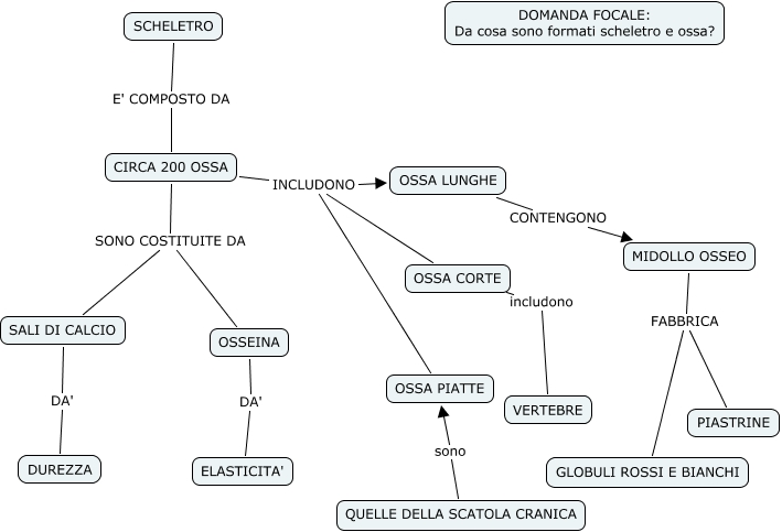 SCHELETRO2, CIRCA 200 OSSA INCLUDONO OSSA CORTE, OSSEINA DA' ELASTICITA', OSSA CORTE includono VERTEBRE, SCHELETRO E' COMPOSTO DA CIRCA 200 OSSA, OSSA LUNGHE CONTENGONO MIDOLLO OSSEO, MIDOLLO OSSEO FABBRICA GLOBULI ROSSI E BIANCHI, SALI DI CALCIO DA' DUREZZA, CIRCA 200 OSSA INCLUDONO OSSA PIATTE, CIRCA 200 OSSA SONO COSTITUITE DA OSSEINA, CIRCA 200 OSSA INCLUDONO OSSA LUNGHE