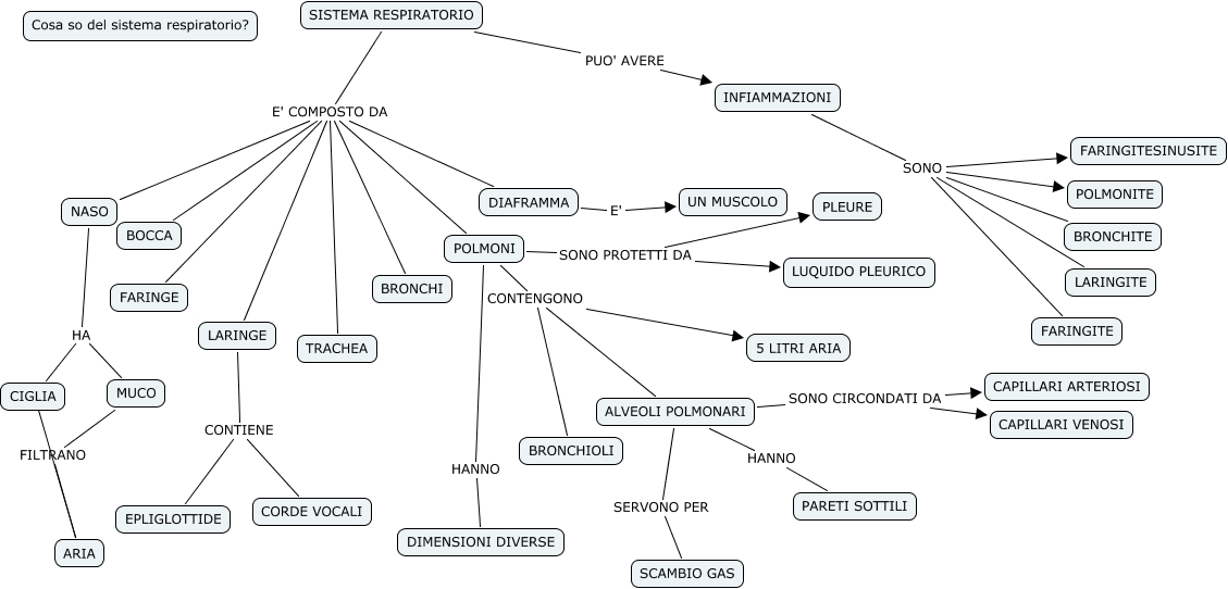 Questa Cmap, creata con IHMC CmapTools, contiene informazioni relative a: SISTEMA RESPIRATORIO, POLMONI CONTENGONO 5 LITRI ARIA, DIAFRAMMA E' UN MUSCOLO, POLMONI SONO PROTETTI DA LUQUIDO PLEURICO, SISTEMA RESPIRATORIO E' COMPOSTO DA DIAFRAMMA, POLMONI CONTENGONO BRONCHIOLI, LARINGE CONTIENE CORDE VOCALI, INFIAMMAZIONI SONO LARINGITE, NASO HA MUCO, POLMONI SONO PROTETTI DA PLEURE, SISTEMA RESPIRATORIO E' COMPOSTO DA FARINGE, POLMONI CONTENGONO ALVEOLI POLMONARI, SISTEMA RESPIRATORIO E' COMPOSTO DA LARINGE, ALVEOLI POLMONARI SONO CIRCONDATI DA CAPILLARI VENOSI, SISTEMA RESPIRATORIO PUO' AVERE INFIAMMAZIONI, SISTEMA RESPIRATORIO E' COMPOSTO DA TRACHEA, SISTEMA RESPIRATORIO E' COMPOSTO DA BOCCA, SISTEMA RESPIRATORIO E' COMPOSTO DA BRONCHI, CIGLIA ???? ARIA, INFIAMMAZIONI SONO FARINGITESINUSITE, ALVEOLI POLMONARI HANNO PARETI SOTTILI