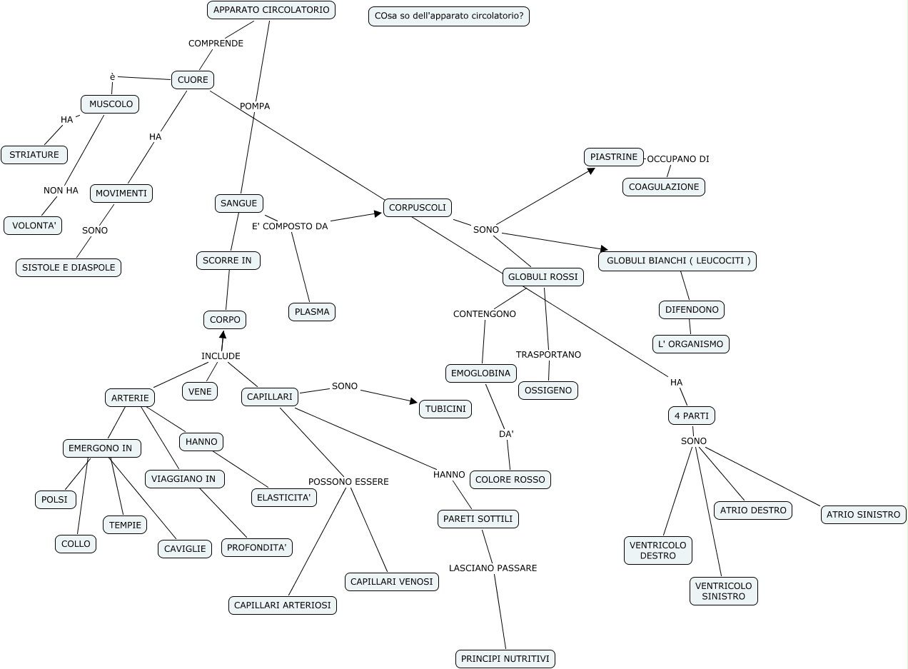 Questa Cmap, creata con IHMC CmapTools, contiene informazioni relative a: MAPPA CONCETTUALE APPARATO CIRCOLATORIO, EMOGLOBINA DA' COLORE ROSSO, APPARATO CIRCOLATORIO COMPRENDE CUORE, ARTERIE ???? EMERGONO IN, ARTERIE ???? VIAGGIANO IN, HANNO ???? ELASTICITA', CORPO INCLUDE ARTERIE, 4 PARTI SONO VENTRICOLO SINISTRO, 4 PARTI SONO VENTRICOLO DESTRO, 4 PARTI SONO ATRIO SINISTRO, CORPUSCOLI SONO PIASTRINE, CAPILLARI POSSONO ESSERE CAPILLARI ARTERIOSI, SCORRE IN ???? CORPO, MUSCOLO NON HA VOLONTA', 4 PARTI SONO ATRIO DESTRO, GLOBULI ROSSI TRASPORTANO OSSIGENO, SANGUE E' COMPOSTO DA CORPUSCOLI, CORPUSCOLI SONO GLOBULI ROSSI, EMERGONO IN ???? TEMPIE, GLOBULI BIANCHI ( LEUCOCITI ) ???? DIFENDONO, CAPILLARI SONO TUBICINI
