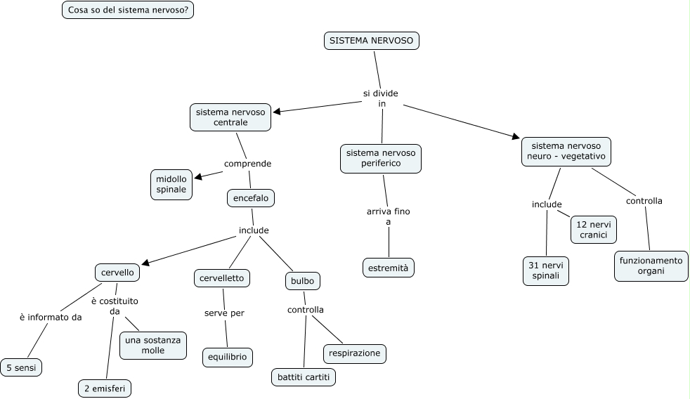 Questa Cmap, creata con IHMC CmapTools, contiene informazioni relative a: sistema nervoso, sistema nervoso centrale comprende midollo spinale, sistema nervoso neuro - vegetativo controlla funzionamento organi, sistema nervoso neuro - vegetativo include 12 nervi cranici, sistema nervoso neuro - vegetativo include 31 nervi spinali, cervello è costituito da una sostanza molle, sistema nervoso centrale comprende encefalo, bulbo controlla battiti cartiti, cervello è costituito da 2 emisferi, sistema nervoso periferico arriva fino a estremità, cervello è informato da 5 sensi, SISTEMA NERVOSO si divide in sistema nervoso centrale, SISTEMA NERVOSO si divide in sistema nervoso neuro - vegetativo, encefalo include cervelletto, SISTEMA NERVOSO si divide in sistema nervoso periferico, encefalo include bulbo, cervelletto serve per equilibrio, bulbo controlla respirazione, encefalo include cervello