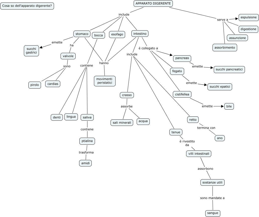 Questa Cmap, creata con IHMC CmapTools, contiene informazioni relative a: apparato digerente, intestino include retto, pancreas emette succhi pancreatici, intestino è collegato a fegato, crasso assorbe acqua, APPARATO DIGERENTE serve a espulsione, bocca contiene saliva, intestino è collegato a cistifellea, intestino hanno movimenti peristatici, APPARATO DIGERENTE serve a digestione, saliva contiene ptialina, crasso assorbe sali minerali, sostanze utili sono mandate a sangue, fegato emette succhi epatici, villi intestinali assorbono sostanze utili, bocca contiene denti, APPARATO DIGERENTE include esofago, stomaco hanno movimenti peristatici, intestino include tenue, retto termina con ano, cistifellea emette bile
