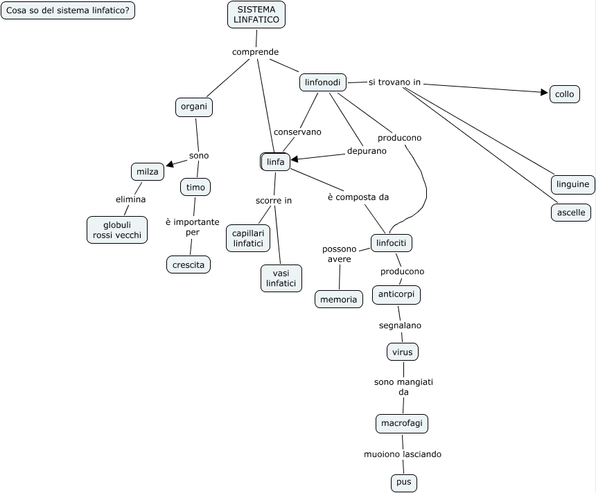 Questa Cmap, creata con IHMC CmapTools, contiene informazioni relative a: mappa sistema linfatico, milza elimina globuli rossi vecchi, anticorpi segnalano virus, linfonodi conservano linfa, virus sono mangiati da macrofagi, macrofagi muoiono lasciando pus, SISTEMA LINFATICO comprende linfonodi, organi sono timo, linfa scorre in vasi linfatici, linfonodi si trovano in ascelle, organi sono milza, linfa è composta da linfociti, timo è importante per crescita, SISTEMA LINFATICO comprende organi, linfonodi si trovano in collo, linfonodi depurano linfa, SISTEMA LINFATICO comprende linfa, linfa scorre in capillari linfatici, linfociti producono anticorpi, linfonodi si trovano in linguine, linfociti possono avere memoria