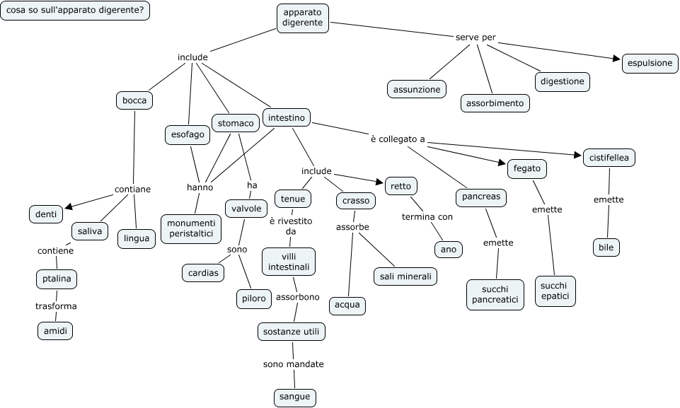 map con apparato digerente, esofago hanno monumenti peristaltici, tenue è rivestito da villi intestinali, bocca contiane denti, apparato digerente include stomaco, bocca contiane saliva, apparato digerente serve per assunzione, saliva contiene ptalina, pancreas emette succhi pancreatici, stomaco ha valvole, apparato digerente include bocca