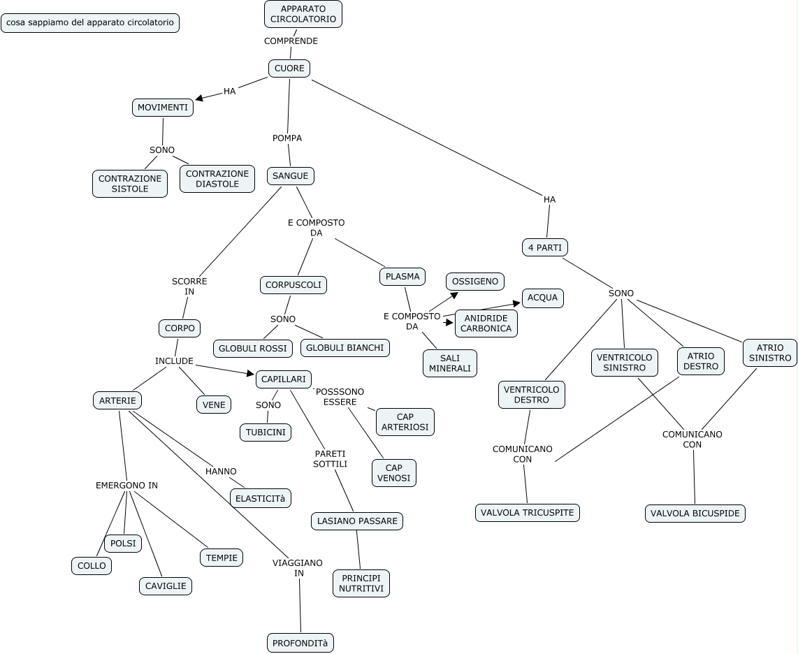 Questa Cmap, creata con IHMC CmapTools, contiene informazioni relative a: map conc MAPPA CONC SISTE CURCO, VENTRICOLO SINISTRO COMUNICANO CON VALVOLA BICUSPIDE, SANGUE E COMPOSTO DA PLASMA, CUORE HA MOVIMENTI, PLASMA E COMPOSTO DA ACQUA, MOVIMENTI SONO CONTRAZIONE SISTOLE, ATRIO DESTRO COMUNICANO CON VALVOLA TRICUSPITE, CAPILLARI POSSSONO ESSERE CAP VENOSI, 4 PARTI SONO ATRIO SINISTRO, APPARATO CIRCOLATORIO COMPRENDE CUORE, VENTRICOLO DESTRO COMUNICANO CON VALVOLA TRICUSPITE, CORPO INCLUDE CAPILLARI, CUORE POMPA SANGUE, ARTERIE EMERGONO IN COLLO, LASIANO PASSARE ???? PRINCIPI NUTRITIVI, ARTERIE HANNO ELASTICITà, PLASMA E COMPOSTO DA OSSIGENO, MOVIMENTI SONO CONTRAZIONE DIASTOLE, CAPILLARI PARETI SOTTILI LASIANO PASSARE, ARTERIE EMERGONO IN CAVIGLIE, 4 PARTI SONO ATRIO DESTRO