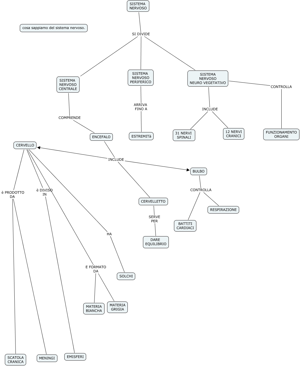 Questa Cmap, creata con IHMC CmapTools, contiene informazioni relative a: map conc SISTEMA NERVOSO, SISTEMA NERVOSO SI DIVIDE SISTEMA NERVOSO NEURO VEGETATIVO, SISTEMA NERVOSO NEURO VEGETATIVO INCLUDE 31 NERVI SPINALI, CERVELLO è DIVISO IN EMISFERI, SISTEMA NERVOSO CENTRALE COMPRENDE ENCEFALO, SISTEMA NERVOSO NEURO VEGETATIVO INCLUDE 12 NERVI CRANICI, SISTEMA NERVOSO NEURO VEGETATIVO CONTROLLA FUNZIONAMENTO ORGANI, BULBO CONTROLLA RESPIRAZIONE, BULBO CONTROLLA BATTITI CARDIACI, CERVELLETTO SERVE PER DARE EQUILIBRIO, SISTEMA NERVOSO PERIFERICO ARRIVA FINO A ESTREMITà, ENCEFALO INCLUDE CERVELLETTO, SISTEMA NERVOSO SI DIVIDE SISTEMA NERVOSO PERIFERICO, ENCEFALO INCLUDE BULBO, CERVELLO è PRODOTTO DA MENINGI, SISTEMA NERVOSO SI DIVIDE SISTEMA NERVOSO CENTRALE, CERVELLO HA SOLCHI, CERVELLO è PRODOTTO DA SCATOLA CRANICA, ENCEFALO INCLUDE CERVELLO, CERVELLO E FORMATO DA MATERIA GRIGIA, CERVELLO E FORMATO DA MATERIA BIANCHA