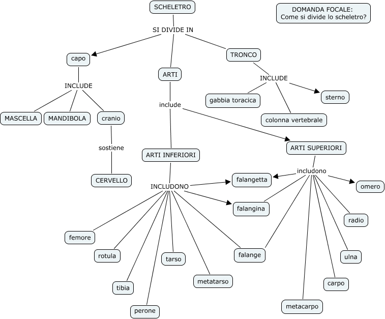 map conc scheletro1, ARTI INFERIORI INCLUDONO falangetta, ARTI INFERIORI INCLUDONO tibia, TRONCO INCLUDE gabbia toracica, ARTI INFERIORI INCLUDONO femore, ARTI INFERIORI INCLUDONO falangina, ARTI INFERIORI INCLUDONO perone, ARTI SUPERIORI includono falangetta, ARTI SUPERIORI includono carpo, ARTI SUPERIORI includono ulna, ARTI INFERIORI INCLUDONO falange