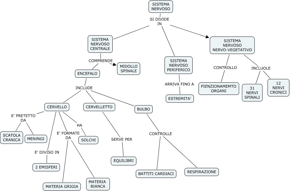 Questa Cmap, creata con IHMC CmapTools, contiene informazioni relative a: SISTEMA NERVOSO, BULBO CONTROLLE RESPIRAZIONE, SISTEMA NERVOSO PERIFERICO ARRIVA FINO A ESTREMITA', BULBO CONTROLLE BATTITI CARDIACI, SISTEMA NERVOSO CENTRALE COMPRENDE ENCEFALO, SISTEMA NERVOSO NERVO-VEGETATIVO INCLUOLE 31 NERVI SPINALI, CERVELLETTO SERVE PER EQUILIBRI, SISTEMA NERVOSO NERVO-VEGETATIVO INCLUOLE 12 NERVI CRONICI, SISTEMA NERVOSO SI DIVIDE IN SISTEMA NERVOSO PERIFERICO, CERVELLO E' FORMATE DA MATERIA GRIGIA, CERVELLO HA SOLCHI, SISTEMA NERVOSO SI DIVIDE IN SISTEMA NERVOSO CENTRALE, CERVELLO E' FORMATE DA MATERIA BIANCA, ENCEFALO INCLUDE CERVELLO, SISTEMA NERVOSO SI DIVIDE IN SISTEMA NERVOSO NERVO-VEGETATIVO, CERVELLO E' DIVISO IN 2 EMISFERI, SISTEMA NERVOSO CENTRALE COMPRENDE MIDOLLO SPINALE, CERVELLO E' PRETETTO DA SCATOLA CRANICA, SISTEMA NERVOSO NERVO-VEGETATIVO CONTROLLO FIENZIONAMEMTO ORGANI, ENCEFALO INCLUDE BULBO, ENCEFALO INCLUDE CERVELLETTO