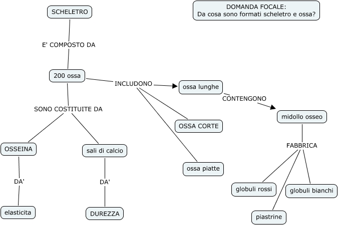 SCHELETRO2, 200 ossa INCLUDONO OSSA CORTE, sali di calcio DA' DUREZZA, SCHELETRO E' COMPOSTO DA 200 ossa, ossa lunghe CONTENGONO midollo osseo, midollo osseo FABBRICA globuli rossi, OSSEINA DA' elasticita, 200 ossa INCLUDONO ossa piatte, 200 ossa SONO COSTITUITE DA sali di calcio, 200 ossa INCLUDONO ossa lunghe, midollo osseo FABBRICA piastrine