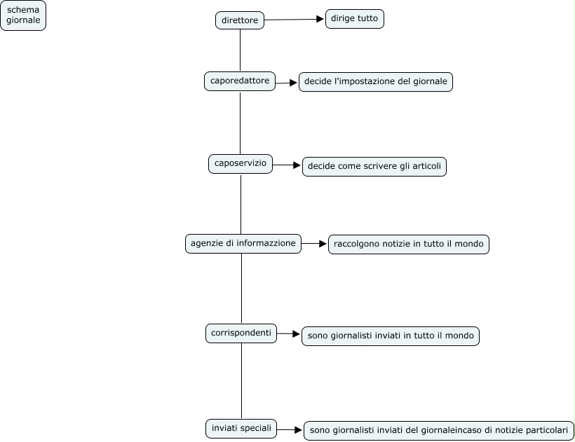 Questa Cmap, creata con IHMC CmapTools, contiene informazioni relative a: mappa sul giornale, caporedattore ???? caposervizio, caposervizio ???? decide come scrivere gli articoli, direttore ???? caporedattore, direttore ???? dirige tutto, caposervizio ???? agenzie di informazzione, corrispondenti ???? sono giornalisti inviati in tutto il mondo, inviati speciali ???? sono giornalisti inviati del giornaleincaso di notizie particolari, agenzie di informazzione ???? raccolgono notizie in tutto il mondo, corrispondenti ???? inviati speciali, caporedattore ???? decide l'impostazione del giornale, agenzie di informazzione ???? corrispondenti