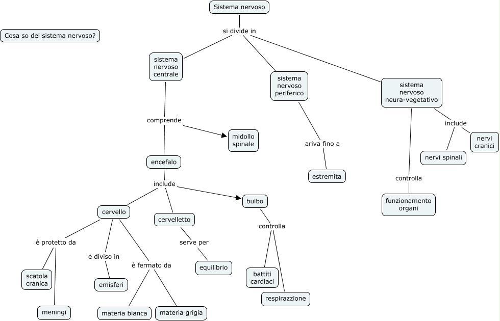 Questa Cmap, creata con IHMC CmapTools, contiene informazioni relative a: sistema nervoso, cervello è fermato da materia bianca, bulbo controlla respirazzione, Sistema nervoso si divide in sistema nervoso periferico, cervello è protetto da meningi, cervello è protetto da scatola cranica, encefalo include bulbo, sistema nervoso neura-vegetativo controlla funzionamento organi, sistema nervoso centrale si divide in sistema nervoso periferico, encefalo include cervello, sistema nervoso centrale comprende encefalo, sistema nervoso periferico ariva fino a estremita, sistema nervoso neura-vegetativo include nervi cranici, encefalo include cervelletto, sistema nervoso centrale si divide in sistema nervoso neura-vegetativo, bulbo controlla battiti cardiaci, cervelletto serve per equilibrio, cervello è diviso in emisferi, Sistema nervoso si divide in sistema nervoso neura-vegetativo, sistema nervoso neura-vegetativo include nervi spinali, sistema nervoso centrale comprende midollo spinale