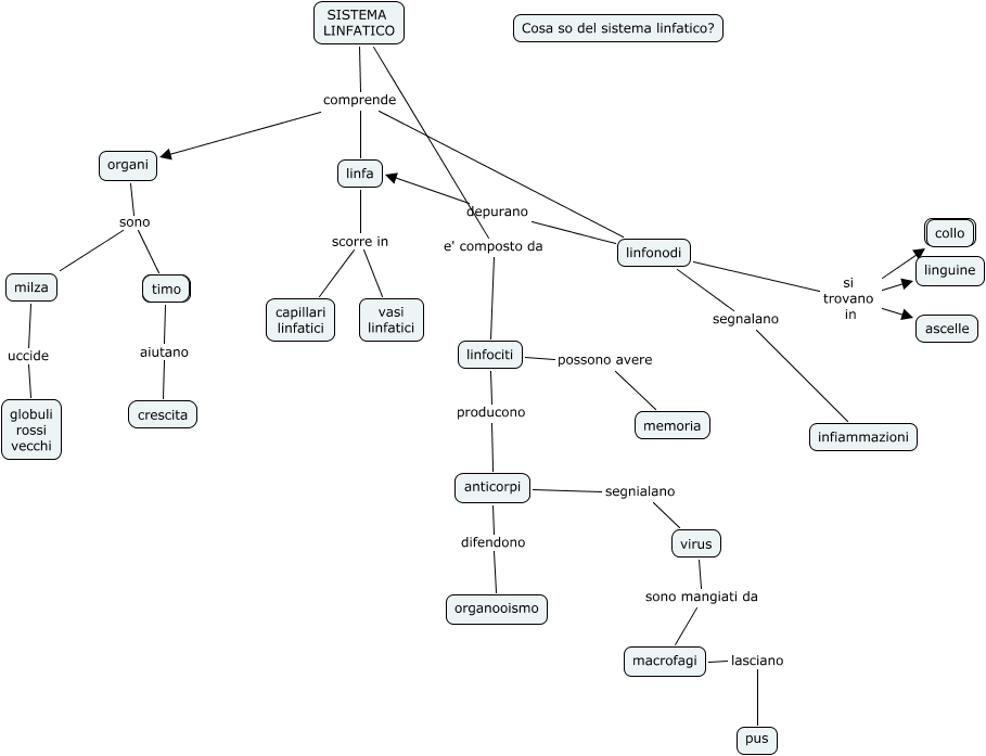 Questa Cmap, creata con IHMC CmapTools, contiene informazioni relative a: mappa sistema linfatico, linfonodi si trovano in linguine, SISTEMA LINFATICO e' composto da linfociti, linfonodi segnalano infiammazioni, anticorpi segnialano virus, macrofagi lasciano pus, organi sono milza, virus sono mangiati da macrofagi, linfa scorre in vasi linfatici, milza uccide globuli rossi vecchi, SISTEMA LINFATICO comprende linfa, SISTEMA LINFATICO comprende linfonodi, anticorpi difendono organooismo, linfa scorre in capillari linfatici, linfonodi depurano linfa, linfociti producono anticorpi, SISTEMA LINFATICO comprende organi, linfonodi si trovano in collo, organi sono timo, linfonodi si trovano in ascelle, timo aiutano crescita
