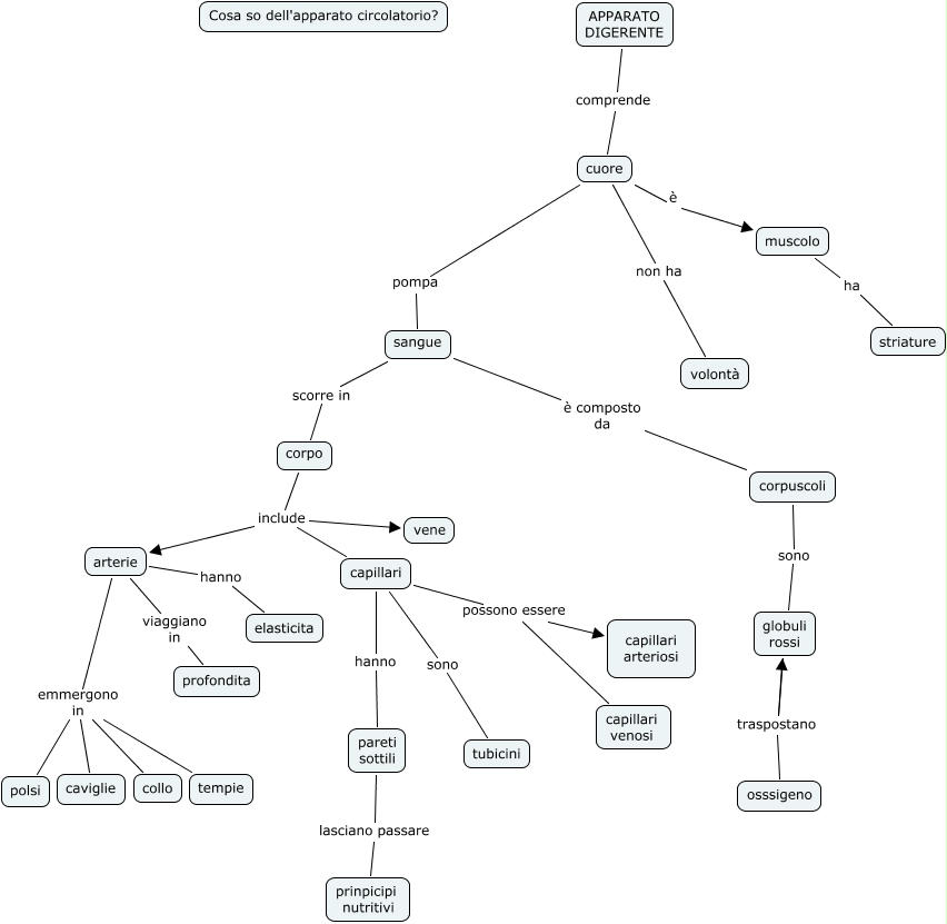 Questa Cmap, creata con IHMC CmapTools, contiene informazioni relative a: apparato circolatorio, arterie hanno elasticita, cuore non ha volontà, arterie emmergono in polsi, corpo include arterie, cuore è muscolo, globuli rossi traspostano osssigeno, arterie emmergono in collo, capillari possono essere capillari venosi, capillari sono tubicini, capillari possono essere capillari arteriosi, cuore pompa sangue, sangue scorre in corpo, muscolo ha striature, arterie emmergono in tempie, corpo include capillari, APPARATO DIGERENTE comprende cuore, corpuscoli sono globuli rossi, arterie viaggiano in profondita, pareti sottili lasciano passare prinpicipi nutritivi, corpo include vene