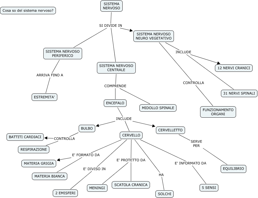 Questa Cmap, creata con IHMC CmapTools, contiene informazioni relative a: MAPPA CONCETTUALE SUL SISTEME NERVOSO, CERVELLO HA SOLCHI, SISTEMA NERVOSO NEURO VEGETATIVO INCLUDE 31 NERVI SPINALI, ENCEFALO INCLUDE CERVELLO, SISTEMA NERVOSO SI DIVIDE IN SISTEMA NERVOSO NEURO VEGETATIVO, ENCEFALO INCLUDE BULBO, SISTEMA NERVOSO SI DIVIDE IN SISTEMA NERVOSO PERIFERICO, CERVELLO E' FORMATO DA MATERIA BIANCA, SISTEMA NERVOSO SI DIVIDE IN SISTEMA NERVOSO CENTRALE, SISTEMA NERVOSO NEURO VEGETATIVO INCLUDE 12 NERVI CRANICI, CERVELLO E' INFORMATO DA 5 SENSI, CERVELLO E' PROTETTO DA MENINGI, CERVELLO E' PROTETTO DA SCATOLA CRANICA, ENCEFALO INCLUDE CERVELLETTO, SISTEMA NERVOSO CENTRALE COMPRENDE ENCEFALO, SISTEMA NERVOSO PERIFERICO ARRIVA FINO A ESTREMITA', BULBO CONTROLLA RESPIRAZIONE, BULBO CONTROLLA BATTITI CARDIACI, CERVELLO E' DIVISO IN 2 EMISFERI, CERVELLO E' FORMATO DA MATERIA GRIGIA, SISTEMA NERVOSO NEURO VEGETATIVO CONTROLLA FUNZIONAMENTO ORGANI
