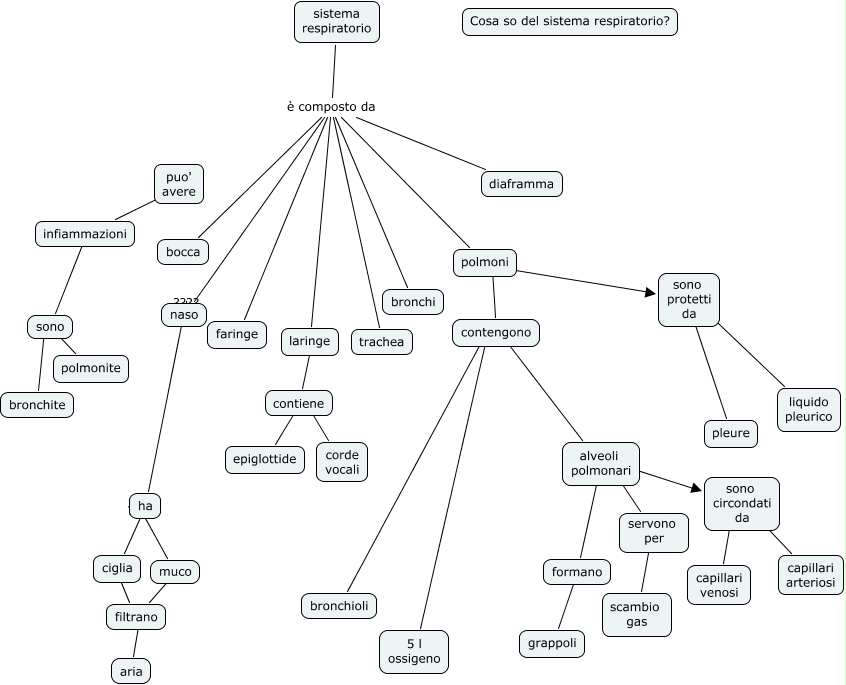 Questa Cmap, creata con IHMC CmapTools, contiene informazioni relative a: sistema respiratorio, sistema respiratorio è composto da bocca, sistema respiratorio è composto da faringe, contengono ???? bronchioli, sono protetti da ???? liquido pleurico, sono ???? bronchite, sistema respiratorio è composto da naso, infiammazioni ???? sono, sono circondati da ???? capillari arteriosi, contiene ???? epiglottide, puo' avere ???? infiammazioni, alveoli polmonari ???? servono per, ciglia ???? filtrano, ha ???? muco, muco ???? filtrano, sistema respiratorio è composto da trachea, polmoni ???? contengono, sistema respiratorio è composto da polmoni, sono circondati da ???? capillari venosi, formano ???? grappoli, sono ???? polmonite