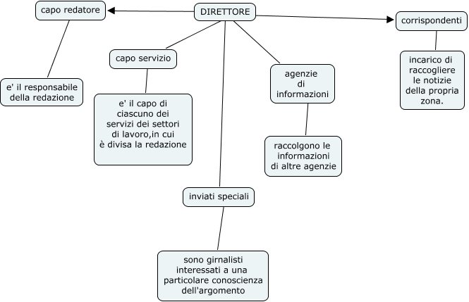 organigramma, capo servizio ???? e' il capo di ciascuno dei servizi dei settori di lavoro,in cui è divisa la redazione, corrispondenti ???? incarico di raccogliere le notizie della propria zona., DIRETTORE ???? capo redatore, inviati speciali ???? sono girnalisti interessati a una particolare conoscienza dell'argomento, agenzie di informazioni ???? raccolgono le informazioni di altre agenzie, DIRETTORE ???? corrispondenti, DIRETTORE ???? capo servizio, DIRETTORE ???? inviati speciali, DIRETTORE ???? agenzie di informazioni, capo redatore ???? e' il responsabile della redazione