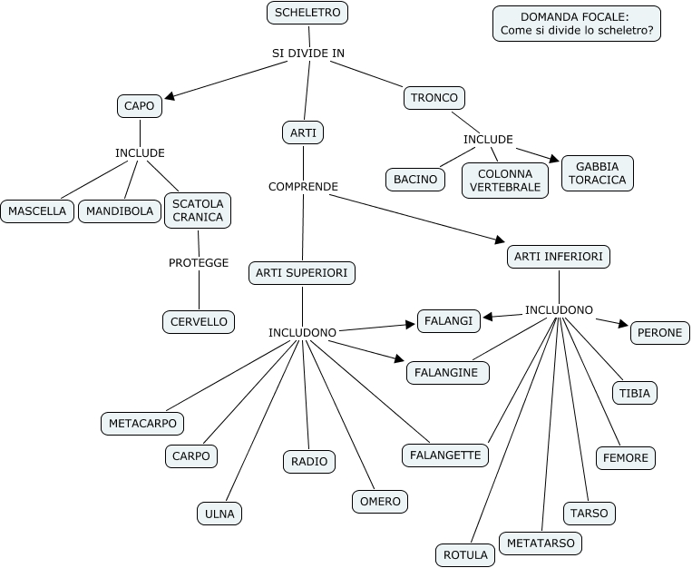scheletro1, ARTI SUPERIORI INCLUDONO ULNA, ARTI SUPERIORI INCLUDONO FALANGETTE, TRONCO INCLUDE BACINO, ARTI SUPERIORI INCLUDONO METACARPO, ARTI INFERIORI INCLUDONO FALANGI, ARTI SUPERIORI INCLUDONO RADIO, ARTI INFERIORI INCLUDONO FEMORE, ARTI INFERIORI INCLUDONO TARSO, ARTI COMPRENDE ARTI INFERIORI, ARTI SUPERIORI INCLUDONO CARPO