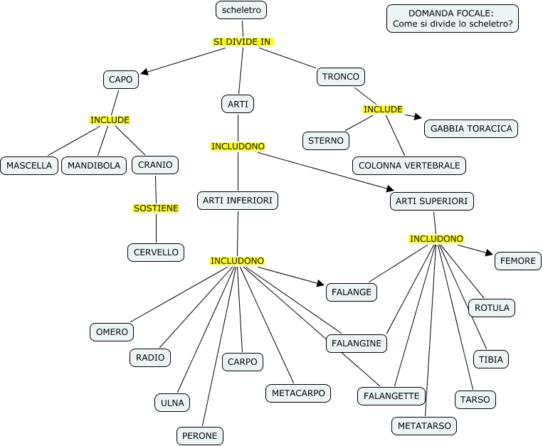 scheletro1, ARTI INFERIORI INCLUDONO FALANGINE, ARTI INFERIORI INCLUDONO ULNA, TRONCO INCLUDE STERNO, CAPO INCLUDE MANDIBOLA, ARTI INFERIORI INCLUDONO CARPO, ARTI SUPERIORI INCLUDONO FALANGETTE, ARTI INFERIORI INCLUDONO OMERO, ARTI SUPERIORI INCLUDONO TARSO, ARTI SUPERIORI INCLUDONO TIBIA, ARTI INCLUDONO ARTI SUPERIORI