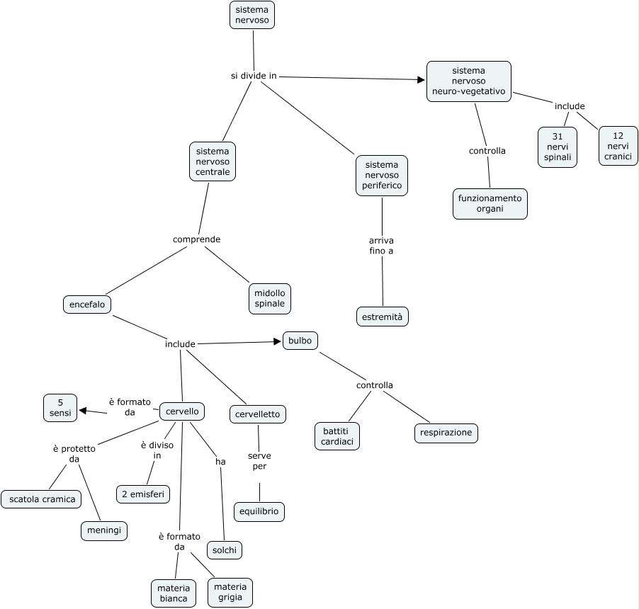 sistema nervoso, sistema nervoso neuro-vegetativo include 12 nervi cranici, cervello ha solchi, sistema nervoso si divide in sistema nervoso periferico, cervello è protetto da scatola cramica, sistema nervoso si divide in sistema nervoso neuro-vegetativo, cervello è formato da materia bianca, cervello è diviso in 2 emisferi, cervello è formato da 5 sensi, cervelletto serve per equilibrio, sistema nervoso si divide in sistema nervoso centrale