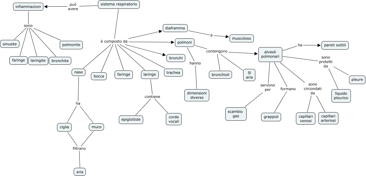 sistema respiratorio, sistema respiratorio è composto da diaframma, sistema respiratorio può avere infiammazioni, laringe contiene corde vocali, infiammazioni sono sinusite, alveoli polmonari formano grappoli, sistema respiratorio è composto da faringe, sistema respiratorio è composto da bocca, infiammazioni sono polmonite, polmoni contengono bronchioli, infiammazioni sono laringite