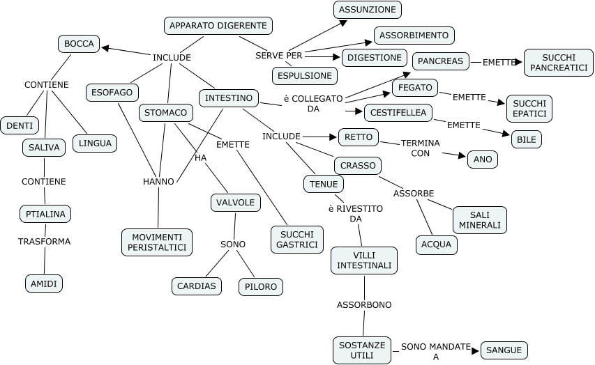 APPARATO DIGERENTE, APPARATO DIGERENTE INCLUDE ESOFAGO, PANCREAS EMETTE SUCCHI PANCREATICI, VILLI INTESTINALI ASSORBONO SOSTANZE UTILI, BOCCA CONTIENE DENTI, VALVOLE SONO CARDIAS, RETTO TERMINA CON ANO, TENUE è RIVESTITO DA VILLI INTESTINALI, BOCCA CONTIENE SALIVA, APPARATO DIGERENTE SERVE PER DIGESTIONE, STOMACO HANNO MOVIMENTI PERISTALTICI