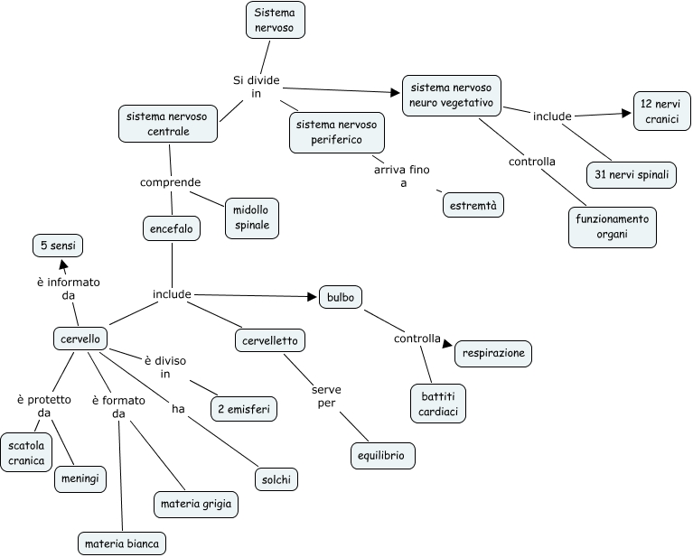 sistema nervoso, cervello è protetto da scatola cranica, sistema nervoso periferico arriva fino a estremtà, bulbo controlla respirazione, encefalo include bulbo, cervello è formato da materia bianca, encefalo include cervelletto, cervello ha solchi, Sistema nervoso Si divide in sistema nervoso neuro vegetativo, sistema nervoso neuro vegetativo include 31 nervi spinali, sistema nervoso neuro vegetativo include 12 nervi cranici