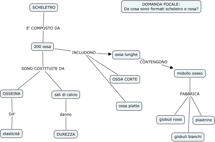 SCHELETRO2, sali di calcio danno DUREZZA, 200 ossa SONO COSTITUITE DA sali di calcio, SCHELETRO E' COMPOSTO DA 200 ossa, 200 ossa INCLUDONO OSSA CORTE, OSSEINA DA' elasticità, midollo osseo FABBRICA globuli rossi, ossa lunghe CONTENGONO midollo osseo, 200 ossa INCLUDONO ossa lunghe, midollo osseo FABBRICA piastrine, 200 ossa INCLUDONO ossa piatte