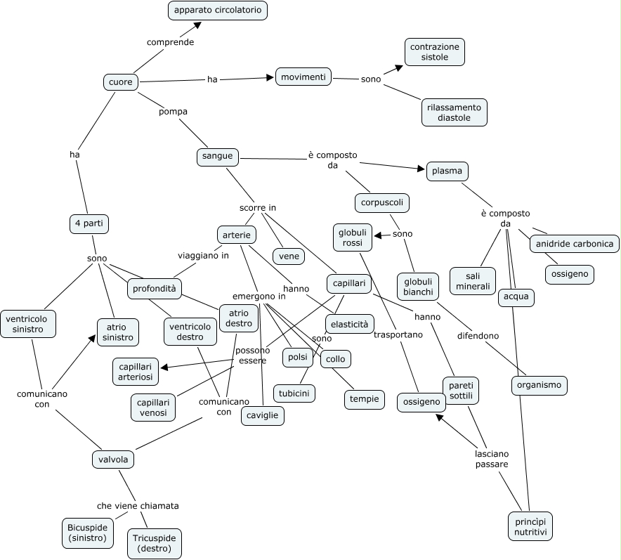 mappa concettuale apparato circolatorio, sangue è composto da corpuscoli, cuore ha 4 parti, princìpi nutritivi è composto da acqua, ventricolo sinistro comunicano con valvola, globuli bianchi difendono organismo, pareti sottili lasciano passare ossigeno, arterie emergono in collo, plasma è composto da acqua, arterie viaggiano in profondità, ventricolo sinistro comunicano con atrio sinistro