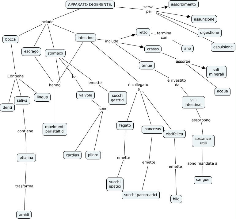 apparato digerente, valvole sono piloro, retto termina con ano, intestino è collegato a cistifellea, intestino include tenue, intestino include retto, APPARATO DIGERENTE. include stomaco, stomaco hanno movimenti peristaltici, intestino hanno movimenti peristaltici, bocca Contiene saliva, APPARATO DIGERENTE. serve per assunzione